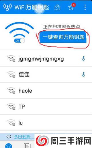2、手机联网并开启wifi,点击一键查询,后面带有钥匙的就是已破解可以连接的热点;