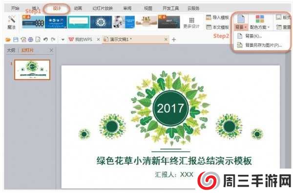 方法二:在功能区,点击“设计”-“背景”进行设置。