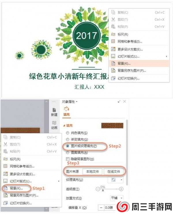 在页面上点击鼠标右键进入”背景”,在右侧窗格内,填充效果选择“图片或纹理填充”,选择本地文件后,再点击“全部应用”。