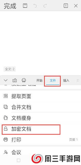 2、已有文档打开后,点击下方工具栏,找到「 文件」下拉,找到「加密文档」,即可进行加密设置。