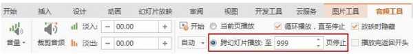 插入背景音乐后,会在幻灯片中显示一个黄色小喇叭。选中小喇叭,点击功能区“音频工具”,设置播放页数范围。