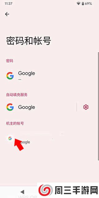 2、点击含有账号关键字的选项,来到下方界面,在机主账号下方可以看到google登录的账号点击它