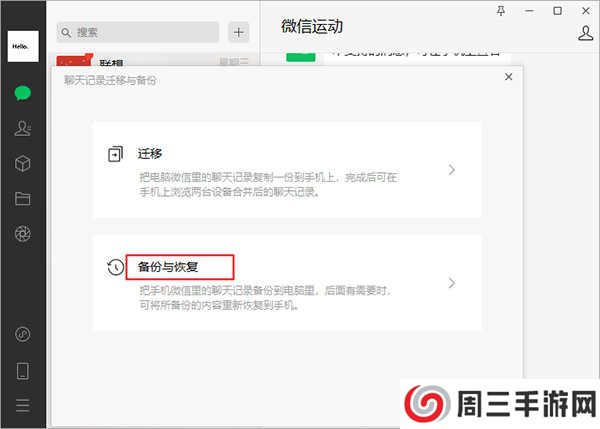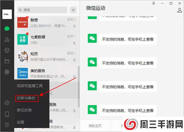 3、点击后,我们会发现弹出来了一个浮窗,其中有四个选项,分别为:“视频号直播工具、迁移与备份、意见反馈、设置”我们点击“迁移与备份”即可