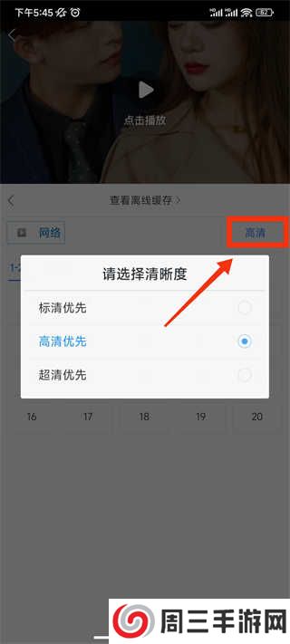 4、点击下载图标之后,就来到了选集界面,点击对应的数字即可缓存相应的集数,右上角还可以选择优先缓存的清晰度。