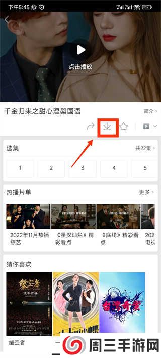 3、进入详情页之后,我们可以看到选集上方的一排图标里有一个下载图标,我们点击这个图标便可以开始缓存电视连续剧了。