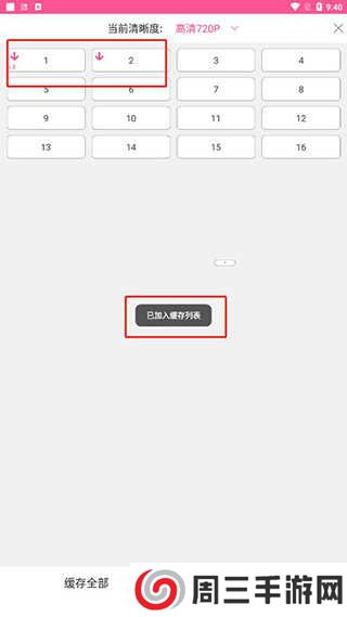 3、在缓存界面中选择缓存清晰度,然后点击需要缓存的集数就能加入缓存列表;