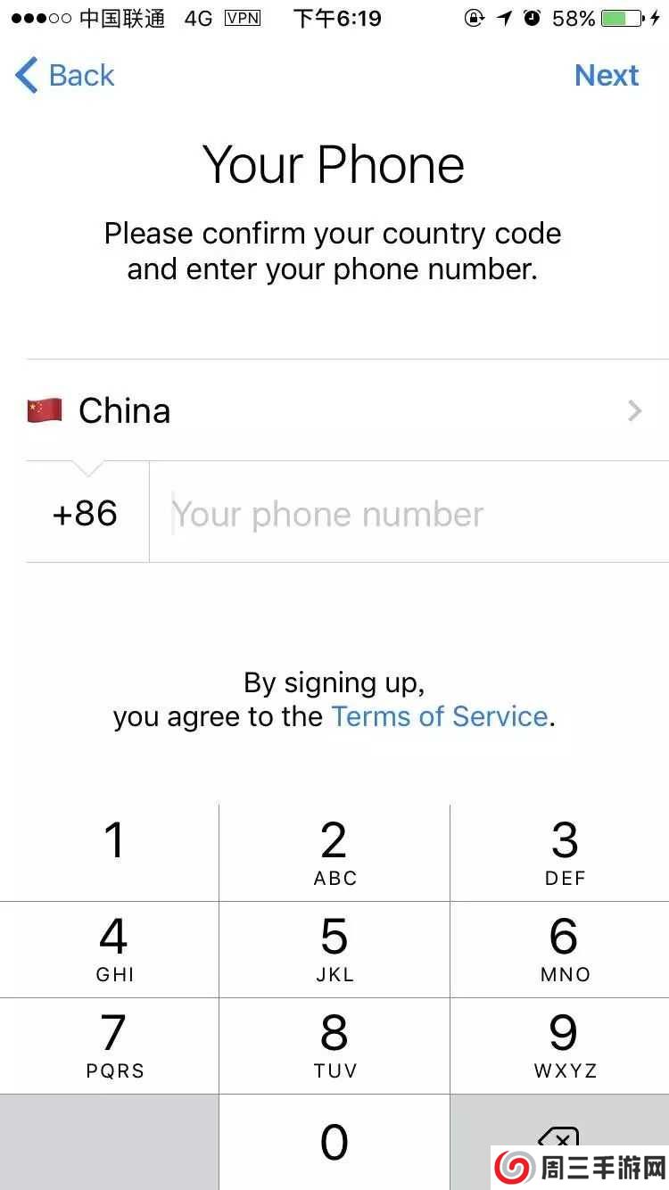 3、安装完纸飞机打开,选择国别,输入电话号码,点击右上角【Next】