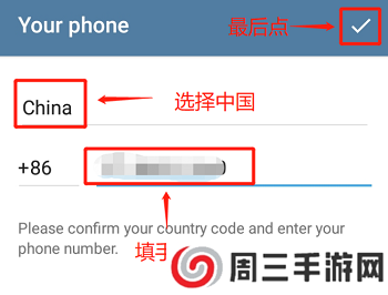 2、在选择国家处选择中国China,填写手机号码,最后点“√”进入下一步