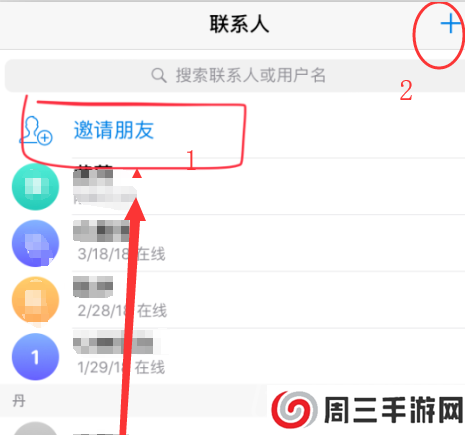 2. 通过邀请朋友添加好友:【联系人】面板下->【邀请朋友】如下图1或者2所示。在弹出的【邀请朋友】面板中勾选朋友->【邀请到】;