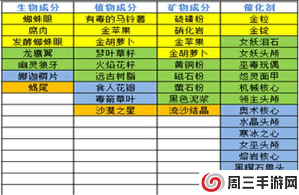 炼金原料分为4个大类:生物材料、矿物材料、植物材料、催化剂。