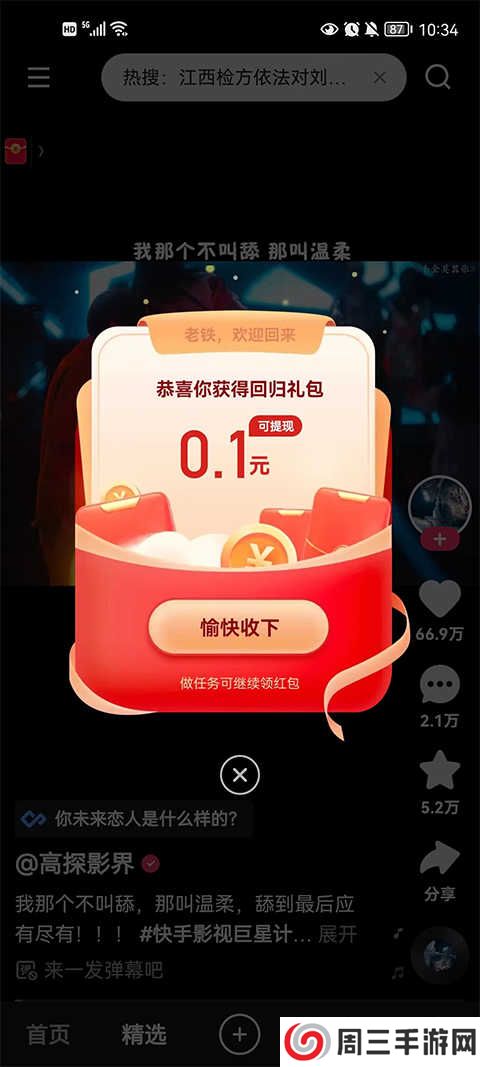 1、不管你是回归的老用户还是在快手官方正版新注册的新用户,都会收到官方赠予的开门红包。