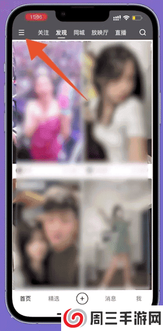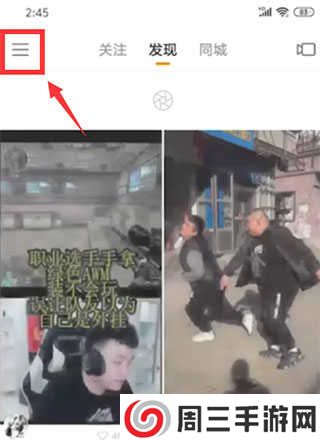 打开快手进入主页面之后,点击页面左上方的三横图标。