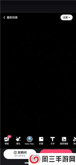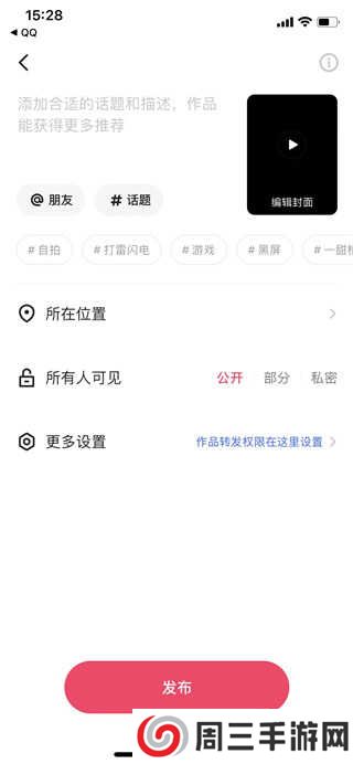 4、这时作品已经制作完成,点击右上角的发布二字,就可以将所拍摄好的作品发布出去了,当然下方还可以设置一些权限。