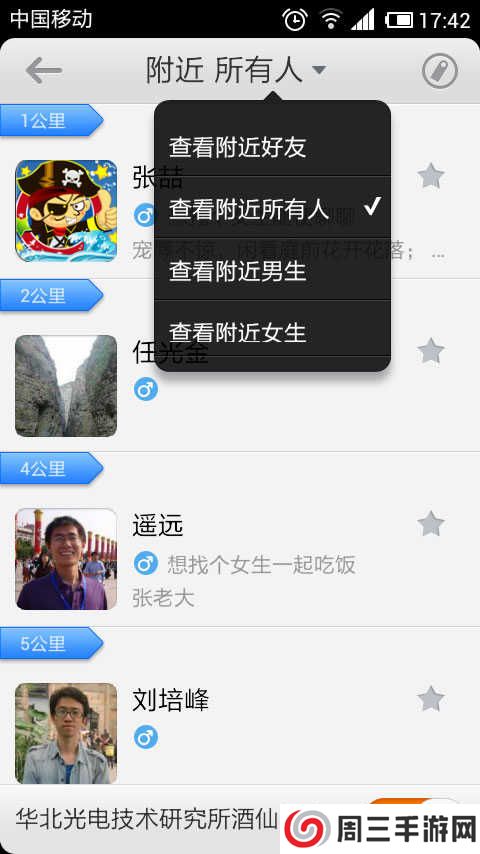通过查看附近的人,可以迅速发现身边的好友,查看时可以选择查看附近所有人、查看附近的男生、查看附近女生,分类明确,添加好友更方便。