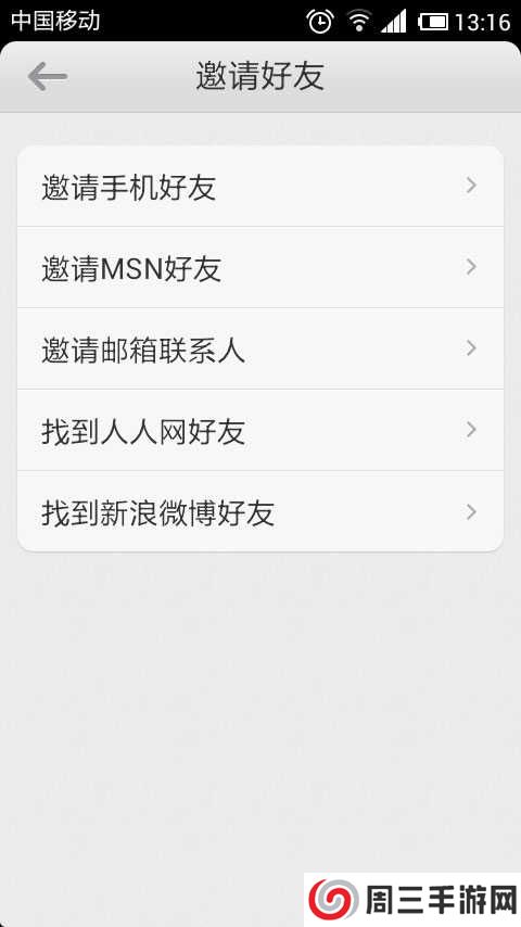 邀请好友,可以邀请手机好友、人人网好友、新浪微博好友、MSN好友以及邮箱联系人。