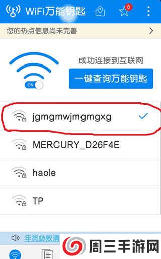 2、手机联网并开启wifi,点击一键查询,后面带有钥匙的就是已破解可以连接的热点;