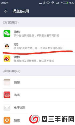 6、同样,你也可以将最常用的qq、微信等双开,来支持你不同的社交等等。双开应用的删除与安卓系统一样,长按你要删除的应用图标,下方会出现创建快捷方式和删除的字样,把图标放到删除附近就可以删除这个应用了。如果还要在双开回来再像前面的步骤添加就可以了