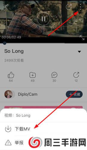 首先你需要进入想要下载的MV页面,不要全屏播放并轻点播放界面,出现菜单,点击右上角【三个点】按钮,接着在下方弹出菜单中点击【下载MV】即可。然后下载的清晰度