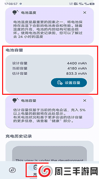 2、点击下方菜单栏中的“充电”按钮进入,在当前页面下滑找到电池容量即可查看电池出厂容量和预估容量(电池寿命);