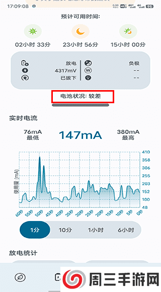 3、另外你还可以在“放电”页面查看电池状况及实时电流输出;