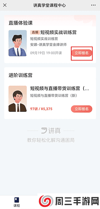 1、打开讲真学堂app,点击首页中课程的立即报名