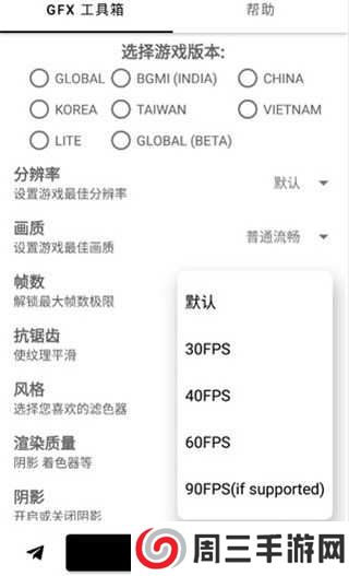 4、在帧数方面,GFX Tool也可以让你轻松得到60祯的上限,只需要在“FPS”中选择“60”即可。除此以外,GFX Tool还可以控制阴影和抗锯齿的开关,可谓是面面俱到。