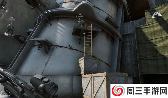 2、在工业撤离点有一个破损的建筑,在这里沿着梯子爬上去。