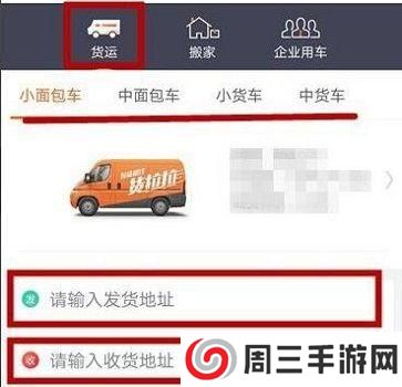 3、如果要“ 货运 ”,那么需要先选择车型,再输入发货地址和收货地址。