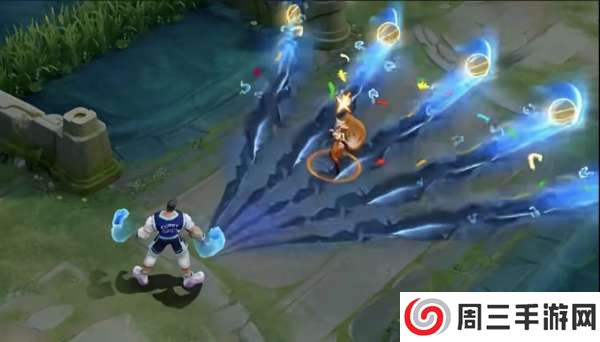 一技能位移后地面出现篮球图标,二技能召唤正义之手握住篮球,周围溅射出水花特效。