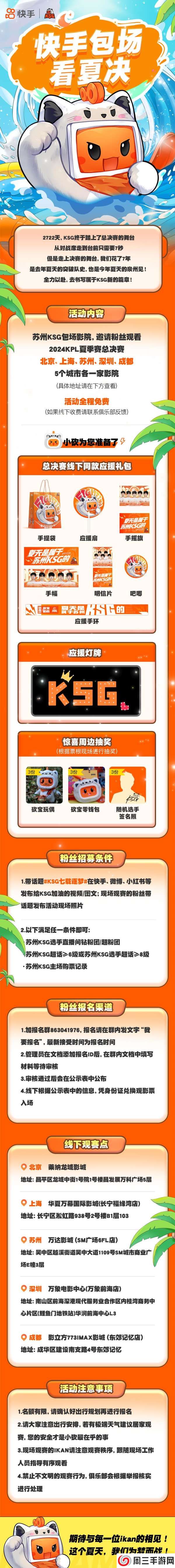 虎扑09月11日讯 KSG发布五城包场活动,同时给虎扑的JRs送出福利啦,在本条新闻帖下方评论区评论为KSG加油,抽五位JRs免费参与线下包场观赛活动(因城市限制,将优先抽取北京、上海、苏州、成都、深圳的JRs)活动原文如下: