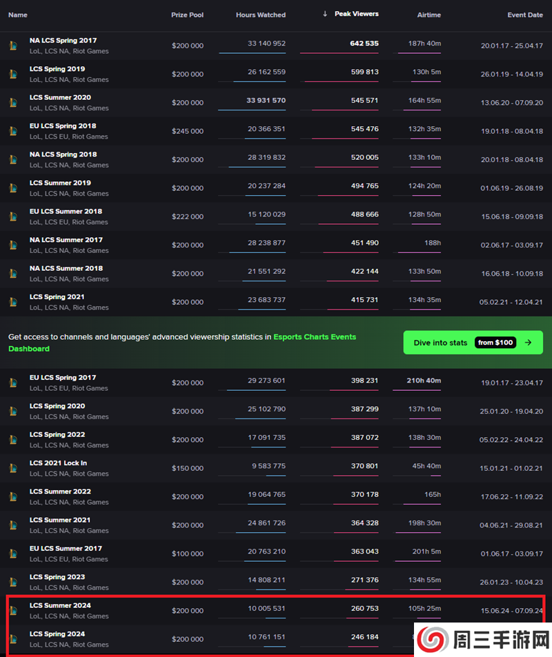 春季赛24.6万,赛季总决赛26万的峰值观众数,不但离2017年NALCS春季赛的64万最高纪录相差甚远,而且已经全部被巴西赛区CBLOL(2024第一赛季46万,第二赛季33万)超过。