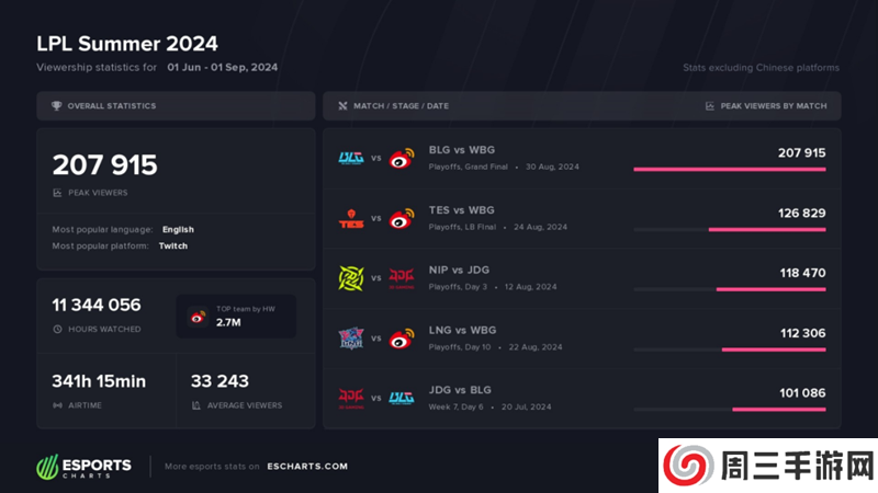 2024LPL夏季赛总决赛在海外直播平台上峰值观众数达到20.8万,比其他任何场次的数据高出64%。BLG和WBG是海外观众较为关注的战队,JDG与BLG之间进行的一场非季后赛较量,也进入了LPL夏季赛峰值收视TOP5。