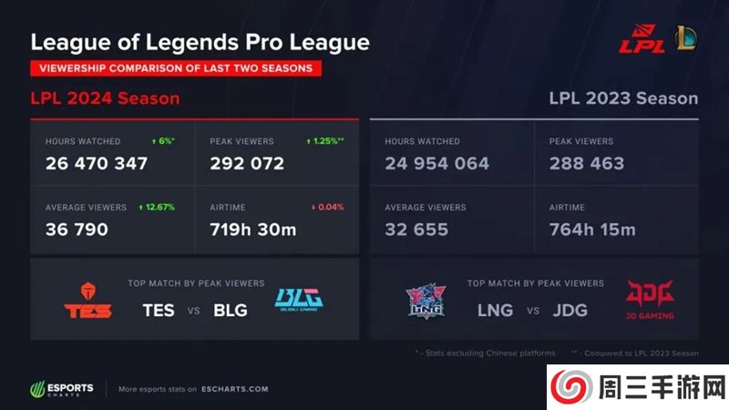 纵观2024LPL全年,最受关注的比赛是TES和BLG之间进行的春季赛总决赛,峰值观众数超过29.2万。