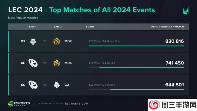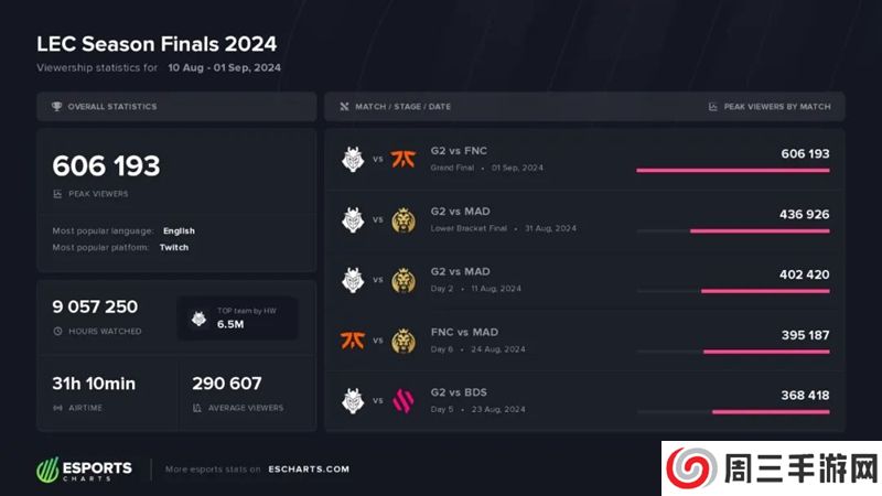 总体而言,LEC 2024赛季总决赛的观看时长为906万小时,平均同时在线观众人数为29.06 万。与去年相比,此次赛事的平均观众数大幅增加,部分原因是 MAD Lions KOI 的关注度有所提高,其创始人兼著名内容创作者Ibai在其拥有1712万粉丝的Twitch直播间中为战队加油助威。