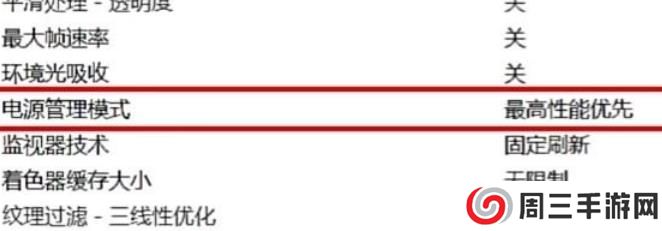 其他的多项也都设置成关闭,然后是电源管理模式选择以“最高性能优先”,监视器技术选择“固定刷新”,着色器缓存大小设置成无限制,纹理过滤质量选择高质量,这个如果设置得太低的话,画面会出现许多马赛克。