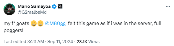 “我的goat们太棒了,gg,M80,这场比赛让我沉浸其中,那种感觉就像我还在队伍里一样,这真是太令人开心了。”