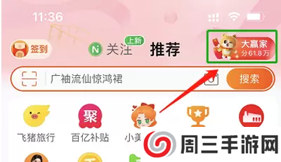 第一步打开淘宝,在淘宝首页可以看到【大赢家】的小图标,点击进入;