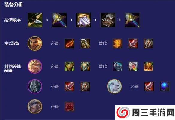 分析:主拿经济强化,经验强化,早点上九抢五费,给个光明武器就锁血。