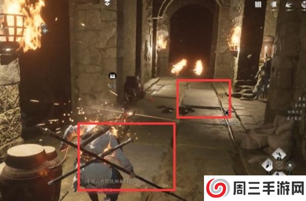 3、下楼后,使用火箭点燃灯箱,即可照亮前方的道路。