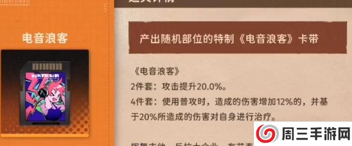 电音浪客:辅助治疗套装。两件套提升攻击力20%。四件套使用普攻时造成的伤害提升12%,并且基于20%所造成的伤害,会对自身进行治疗。