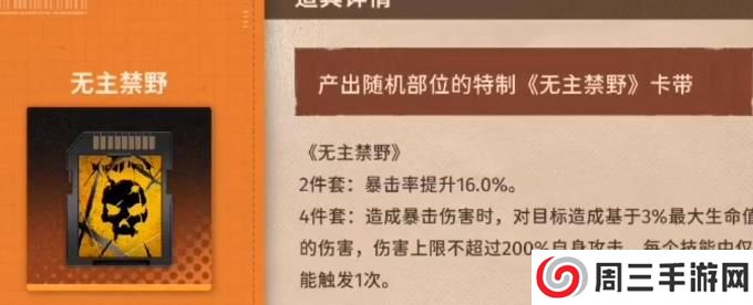 无主荒野:暴击套装效果。两件套提升16%暴击率,四件套造成暴击伤害时,对目标造成3%的最大生命值,但是每个技能只能触发一次效果,伤害的上限不会超过携带者的200%攻击力。