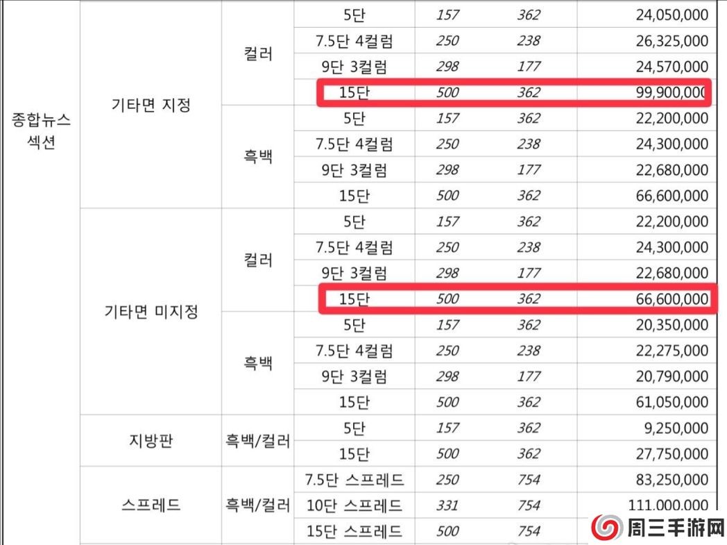 作为参考《综合新闻》报纸的广告价格:未指定价格是六千多万韩元,指定价格是接近一亿韩元。