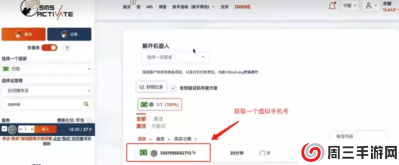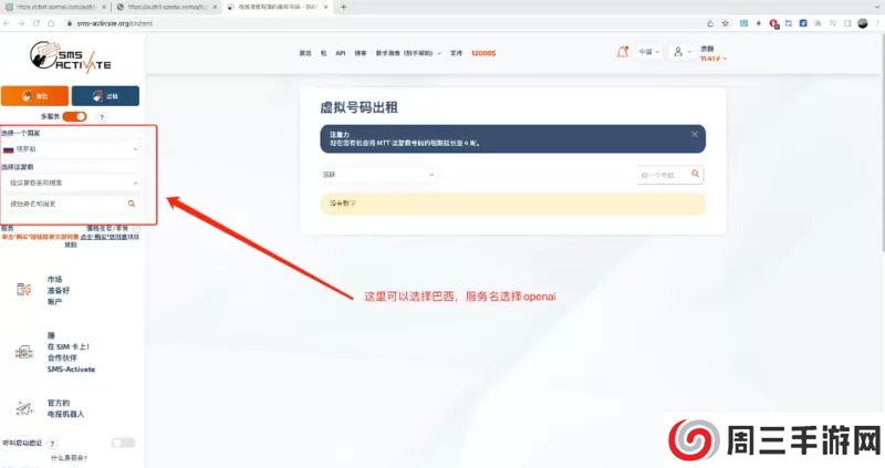 9、可以去租借虚拟号码,选择巴西,服务名选择[openai]。