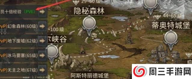 左下角都是玩法,特利亚德大陆右边的逆世界也有好多玩法, 这是我们选择“会员十倍地图”即可进入十倍地图