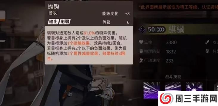 三技能由不得你作为超限技能能够对全部敌人造成的额外伤害更高,有负面效果会让骐骥直接破甲,负面效果越多,依次会增加暴击率和暴击伤害;被动天赋就是给部分队友增加防御力。从他的技能可以看出打伤害太依赖于负面效果的叠加,如果对手的辅助是专门解除这种负面效果的他就非常吃力,输出不太稳定,所以不建议作为主c培养。