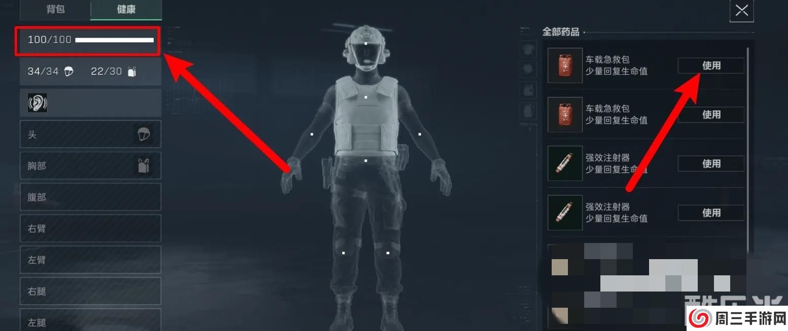 在健康界面找到车载急救包,点击使用即可回复生命值。