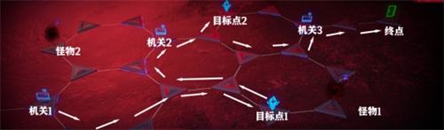 玩家们可以先前往机一关开启机关,然后在根据路线前往目标点一,前往的同时会激活怪物。