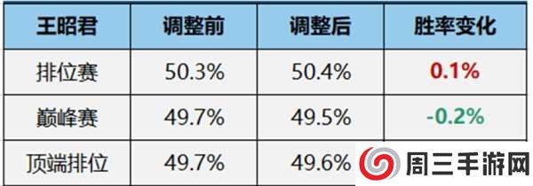 调整后王昭君巅峰赛胜率从49.7%下滑至49.5%,因为王昭君基础伤害下调幅度要比弈星大,所以整体强度反而下滑了。