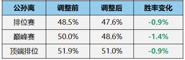 调整后公孙离三榜胜率出现明显下滑,巅峰赛胜率从50%下滑至48.6%,顶端局胜率从51.9%下滑至51%。