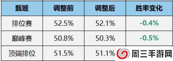 调整后甄姬巅峰赛胜率从50.8%下滑至50.3%,不过值得注意的是甄姬排位胜率依旧高达52.1%,在中低分段的表现依旧突出。